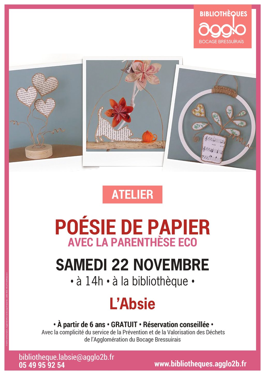Le samedi 22/11, à 14 h, c'est l'atelier poésie de papier à la Bibliothèque de l'Absie !
