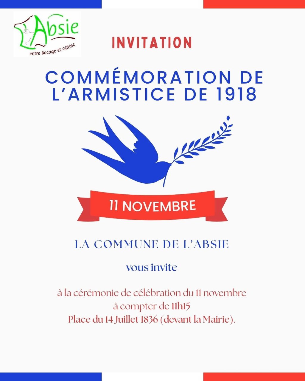 La Commune de l'Absie vous invite à la cérémonie de célébration du 11 novembre, qui aura lieu le mardi 11 novembre 2025 à compter de 11h15, Place du 14 Juillet 1836 (devant la Mairie).