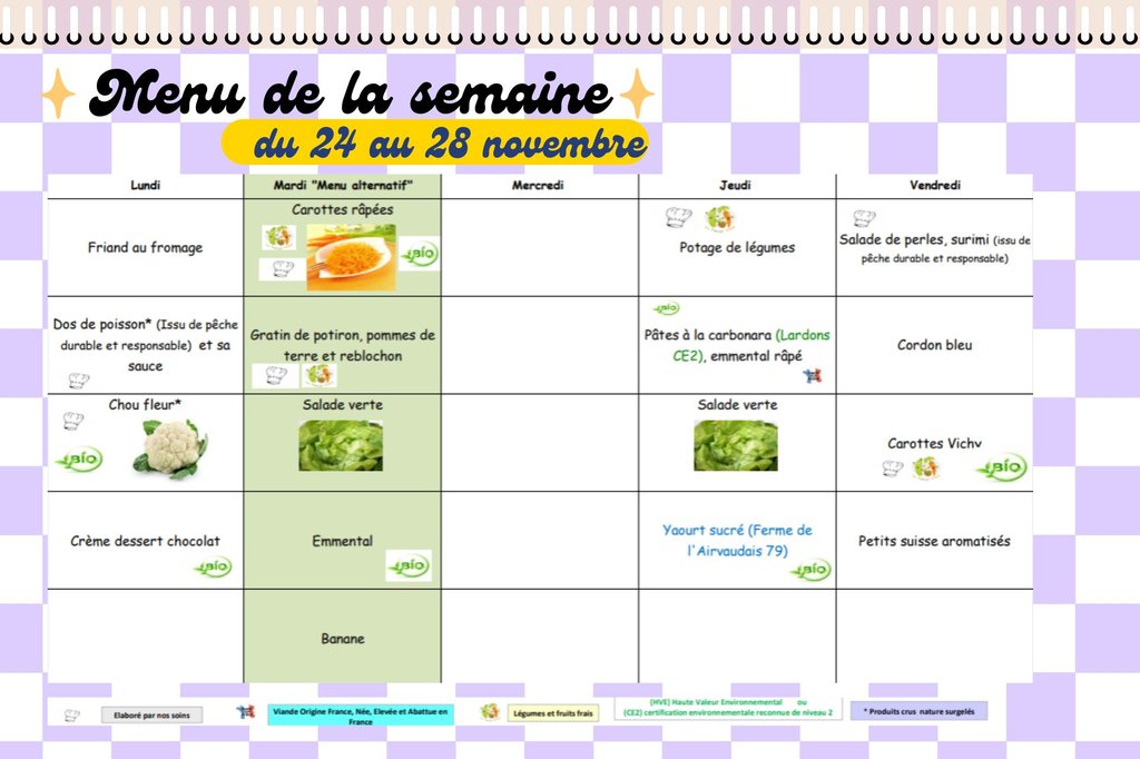 Menus Restauration Scolaire de l'Absie, du 24 au 28 novembre 2025 ! 🍌