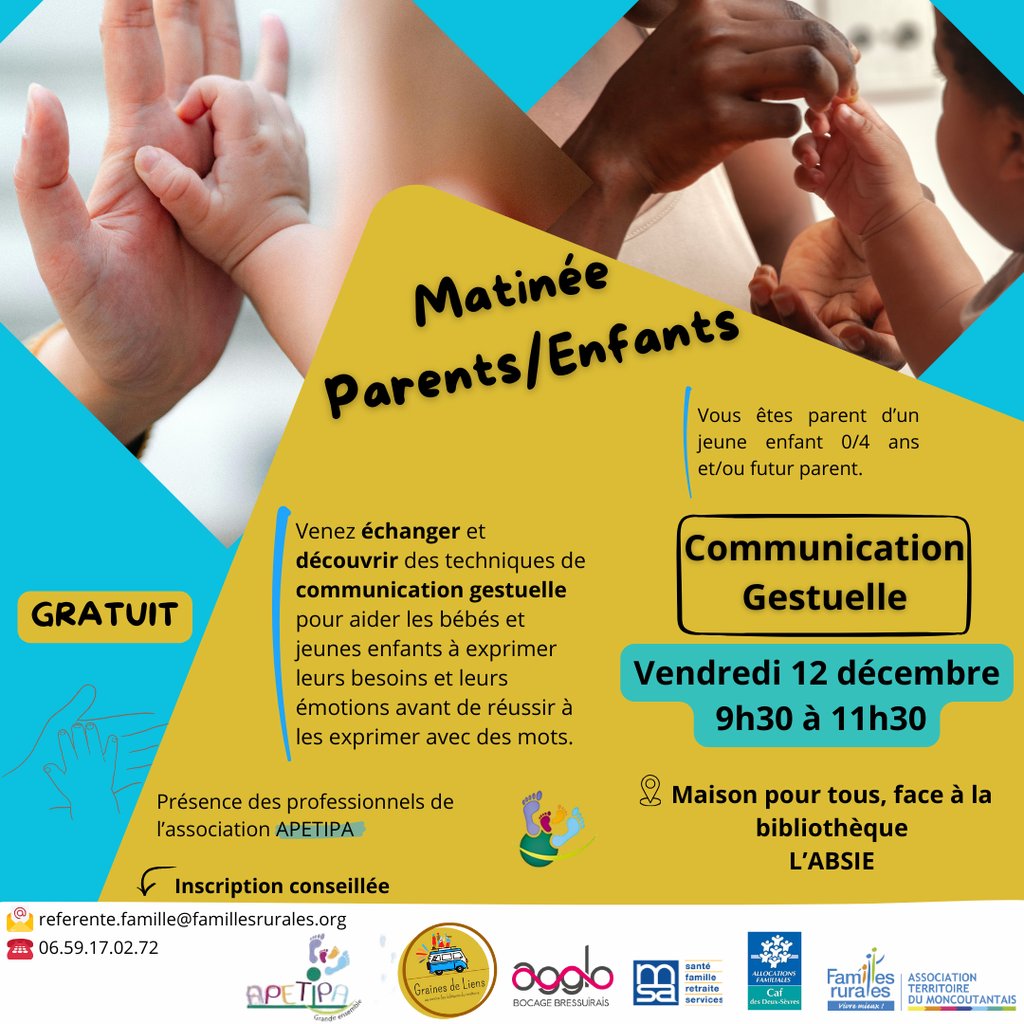 Venez échanger et découvrir des techniques de communication gestuelle pour aider les bébés et jeunes enfants à exprimer leurs besoins et leurs émotions avant de réussir à les exprimer avec des mots !