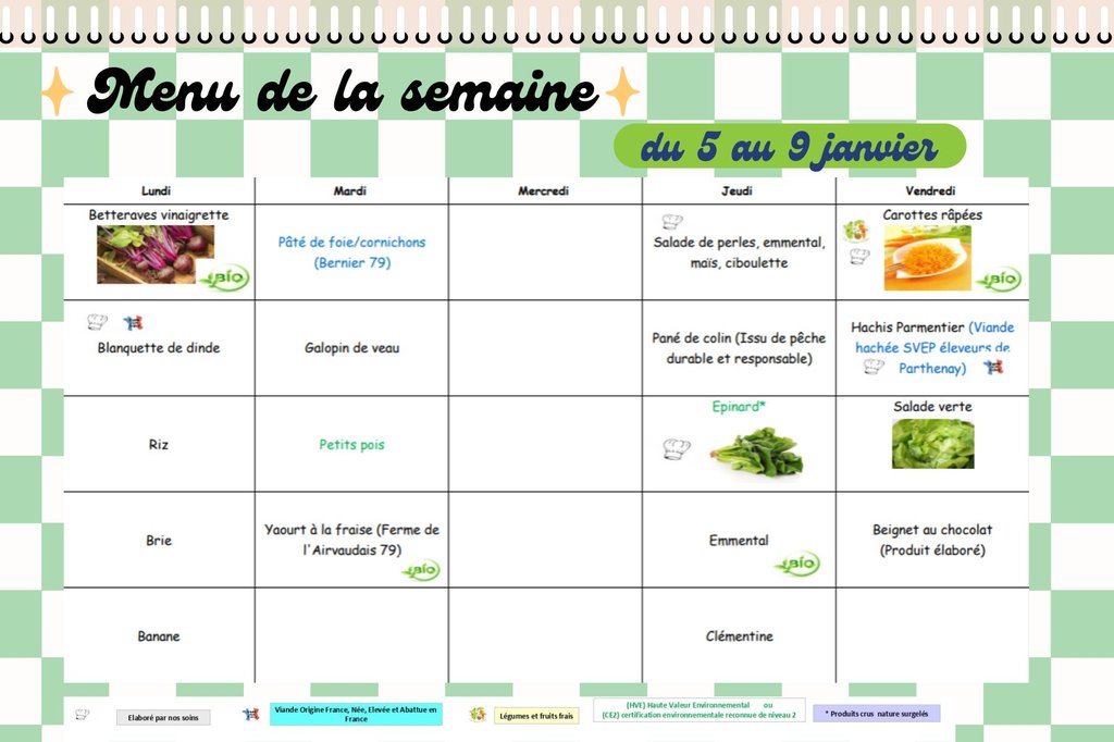 Menus Restauration Scolaire de l'Absie, du 5 au 9 janvier 2026 ! 🍑