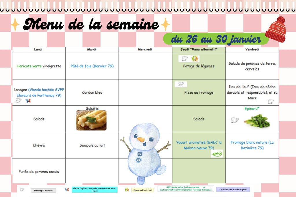Menus Restauration Scolaire de l'Absie, du 26 au 30 janvier 2026 ! 🍗
