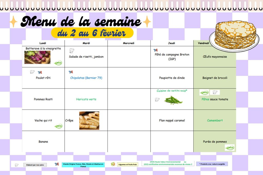 Menus Restauration Scolaire de l'Absie, du 2 au 6 février 2026 ! 🍗
