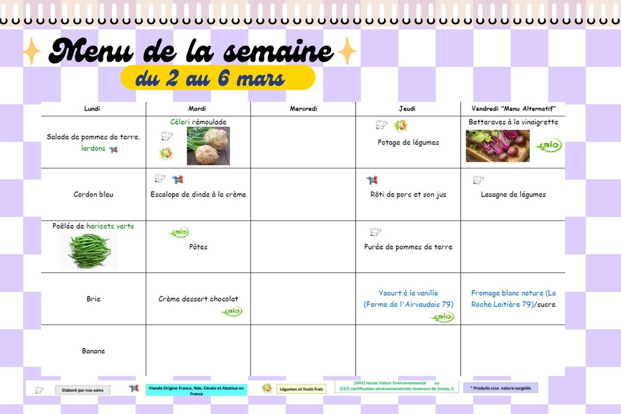 Menus Restauration Scolaire de l'Absie, du 2 au 6 mars 2026 ! 🥑
