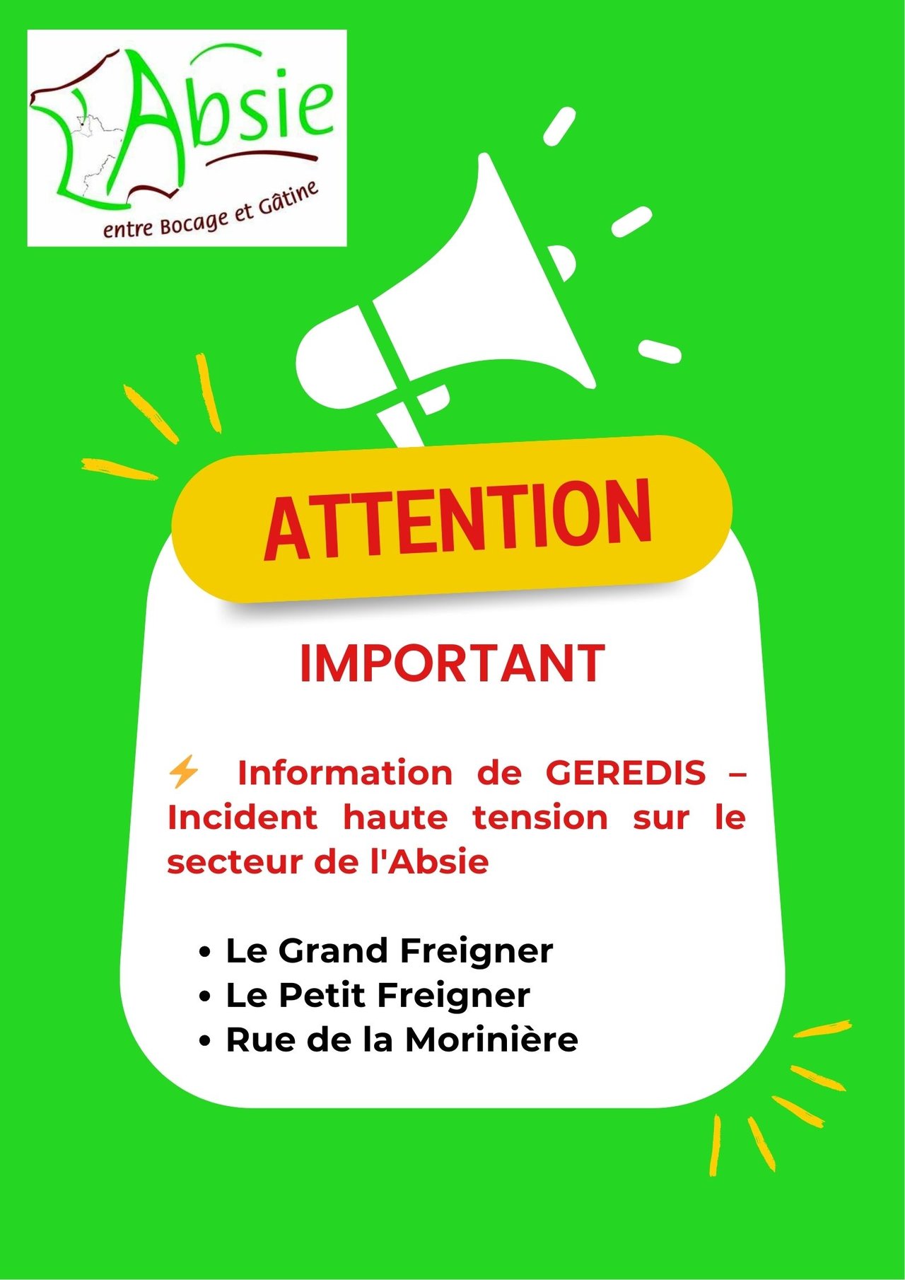⚡ INFORMATION DE GEREDIS – INCIDENT HAUTE TENSION SUR LE SECTEUR DE L'ABSIE